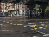 A daytime view of Berlin, Germany. The cityscape is reflected in the water, with bridges and underpasses crossing over the wet asphalt roads. Tall buildings and green trees line the streets, creating a vibrant urban atmosphere.