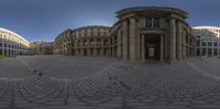 a panoramic image of a circular picture with buildings in the background, one of which is also large