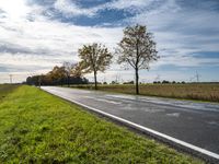 This is a photo taken in the rural countryside of Berlin, Germany, showcasing a beautiful landscape. The image features a paved road surrounded by green grass and trees in the distance. The clear sky overhead adds to the picturesque view. The scene represents the natural beauty of Europe in autumn. In the background, you can also spot wind turbines, highlighting the region's focus on renewable energy and agriculture. This image captures the tranquility and lushness of the German countryside.