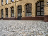 Classic architecture in Berlin, Germany. A brick building with windows and doors. Cobblestone surface leads to a courtyard with a brick wall. Daylight highlights the timeless beauty of this European warehouse.