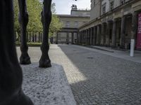 A classic architecture scene in Berlin, Germany. Cobblestone roads and buildings create a charming town atmosphere. The Alte Nationalgalerie stands as a prominent sculpture in the foreground, casting shadows on the cobblestone surface.