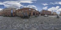 this is a spherical 360 - vr image taken on a cobblestone surface looking like it is in an urban area