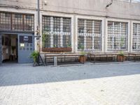 a row of benches sitting on a cobble stone street next to a building with windows and lots of plants