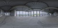 A straight road in Berlin, Germany, lined with modern architecture and elevated parking decks. The city's urban design and concrete streets create an open and spacious feel. Clouds fill the sky, visible through the windows of an empty building.