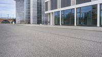 a woman is on a skateboard and it is empty in the street outside of an office building