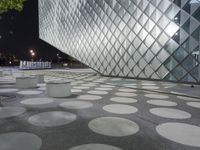 In the heart of Berlin, Germany, nightfall illuminates the modern architectural marvel of the Futurium. White cement benches line an open space, creating circles of urban artistry against the futuristic glass windows. A dynamic blend of design and artificial light.