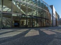 A modern glass wall in Berlin, Germany, casting hard shadows on the cobblestone alleyway. Urban design meets European architecture in this city life setting. Clear sky highlights the museum's innovative surface and open space.