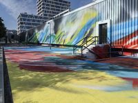 A multicolored graffiti wall in Berlin's vibrant art district. The modern architecture of the warehouse gallery complements the surrounding urban design. The clear sky highlights the vibrant city life in downtown Berlin.