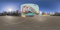 A vibrant graffiti-covered building in Berlin's urban art district. A circular mural adorns the side, featuring a fish-eye view of the city. The colorful facade and street art make this a must-see tourist attraction.