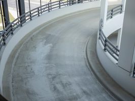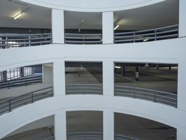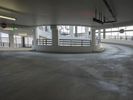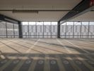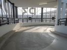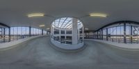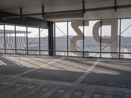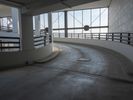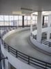 A view of an indoor skate park with a ramp in the sky. The park features many windows and railings, creating a unique architectural structure. It is a popular tourist attraction in Berlin, Germany.