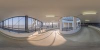 the ramp in the sky of an indoor skate park with many windows and railings