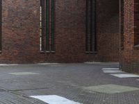 A classic brick warehouse in Berlin, Germany. The industrial charm of the city is evident in the grey brickwork and open courtyard. The urban architecture blends seamlessly with the asphalt road surface.