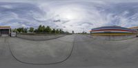 A straight road in Berlin, Germany, lined with industrial factories and modern architecture. A clear sky above the multicolored buildings and concrete surfaces. Urban manufacturing landscape in Europe.