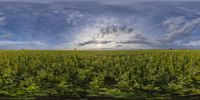 a wide shot of fields of plants under a cloudy sky in summer, with some contrails passing