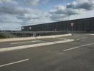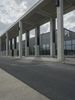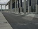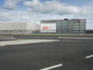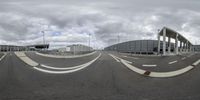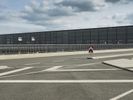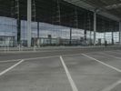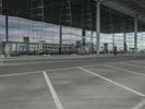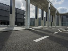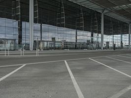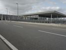 A view of a curved road in front of an airport, captured in a mirror shot from the front of a car. The modern architecture of the airport blends with the urban landscape of Berlin, Germany. The clear day sky reflects on the glass facade of the building.