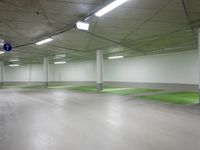 A modern architecture marvel in Berlin, Germany. The large indoor space features green flooring and a concrete ceiling. Sign posts at the end offer directions to the parking deck. A stunning example of European architectural design.