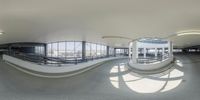 a fish - eye lens panorama shows people walking around the walkway at the airport while the traffic on the way is turning on