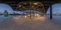 a view of an outdoor bus stop from inside a circular glass door tunnel with a metal roof