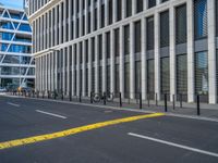 the empty street with bicycles parked in front of the buildings has a sign that says the library on it