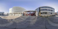 A modern, circular office building in Berlin, Germany. The sleek glass facade reflects the clear sky and surrounding urban landscape. The building's design showcases contemporary European architecture, making it a standout in the business district.