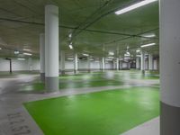 there are yellow and green floors in the large parking garage as well as some green spots