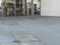 A person stands on a sidewalk in Berlin, Germany, with a modern glass office building in the background. Grey chairs and outdoor tables create an inviting atmosphere in this urban business district. Open spaces and glass walls set a modern tone. Explore the bustling cafes and restaurants of Europe.
