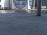 A man standing next to a fountain and water feature in front of a modern office building in Berlin. The sleek architecture blends with the urban design of the city. The business district is reflected in the canal.