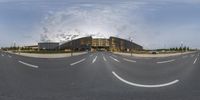 A circular panoramic view of a road in Berlin, Germany, near a modern office building. Cars driving on the asphalt road create light trails. The urban landscape showcases the city's modern architecture and infrastructure.