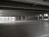 an empty parking garage with a metal floor and a clock on the wall above the doorway