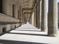 This is an image of a street in Berlin, Germany. The straight road is lined with buildings that showcase classic architecture. The sunlight creates shadows and adds a warm glow to the scene. The symmetrical design of the walkway and the columns give a sense of urban design. The motion blur suggests bustling city life and tourism. In the distance, you can see the Neues Museum, a popular tourist attraction in Berlin. This photo captures the beauty and charm of this European city.
