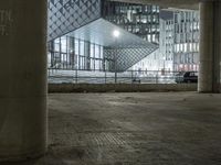 A nighttime view of a modern architectural building in Berlin, Germany. The building's concrete structure and steel surfaces reflect the city lights, creating a dynamic urban design. The open spaces and parking deck add to the city life atmosphere.