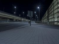 a long exposure shot of an empty city street at night with light posts and the building behind it