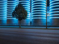 This is an image of the city of Berlin, Germany at night. The modern architecture is illuminated by neon lights, creating a vibrant and metropolitan atmosphere. The city's infrastructure, including roads and factories, can be seen in the background. The image captures the urban design and artificial light that define the city's unique character. The blue hue adds to the nighttime ambiance, while the trees and water provide a natural element. This photo showcases the energetic city life and industrial nature of Berlin, making it a perfect representation of urban Europe.