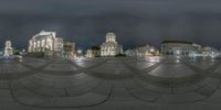 A nighttime view of Berlin's town square, with its iconic circular glass dome. The cityscape is illuminated by artificial light, creating a symmetrical and mesmerizing scene. Classic architecture and cobblestone roads add to the charm of this European metropolis.