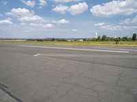 An open space in Berlin, Germany. The clear sky contrasts with the asphalt road and the nature surrounding it. The horizon is dotted with cumulus clouds, creating a serene landscape.