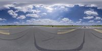 a camera panoramic shot of an airport runway with clouds in the background and a fire hydrant nearby