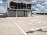 A modern architecture building in Berlin, Germany. The facade features composite material and large windows. The concrete street leads to a parking deck, surrounded by industrial fixtures. Clear skies and cumulus clouds add to the European charm.