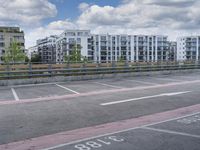 This stock photo features an empty parking lot in the city of Berlin, Germany. Surrounded by tall buildings and a fence, the parking lot is made of asphalt and offers a glimpse of the modern architecture in the area. The clear sky with clouds adds a touch of charm to the scene. Capture the essence of urban design and the vibrant atmosphere of this European city with this striking image. Perfect for illustrating concepts related to urban life, modern architecture, and city transport.