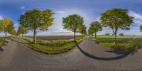 a fisheye lens view of three trees on the roadside in a rural area near the road