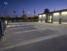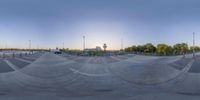 a skateboard park is full of ramps and ramps with trees in the background at sunset