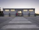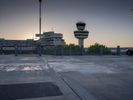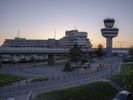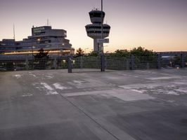 A skateboard park in Berlin, Germany, at sunset. Modern architecture and open spaces create an urban atmosphere. The park overlooks the city skyline, with trees in the background. A popular public space for skateboarders and urban enthusiasts.