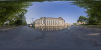 A straight road in Berlin, Germany, lined with classic architecture and residential buildings. Clear sky reflects in the windows. The road leads to a large building, surrounded by open space and vegetation.