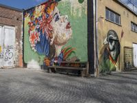 A vibrant city scene in Berlin, Germany. Cobblestone roads wind through the urban landscape, adorned with colorful murals and graffiti. Industrial warehouses and courtyards showcase the city's unique art district.