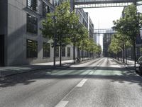 a empty street lined with trees and buildings in a city with a pedestrian bridge above the buildings