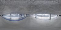 an empty underground structure that has a skate board in the center of it, with multiple mirrors