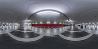 a circular photo in an underground space that is empty with the lights turned on and the floors