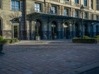 Classic urban architecture in Berlin, Germany, under the bright European sunshine. Hard shadows cast on the paver road as people move through the city. A perfect depiction of city life in Europe.