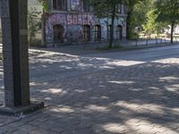 Classic architecture meets urban design in Berlin, Germany. Brick streets are lined with graffiti-covered buildings, while a red fire hydrant stands out on the corner. A vibrant and eclectic residential area.