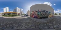 A fish-eye lens captures the vibrant city life of Berlin, Germany. Graffiti-covered walls and cobblestone roads create an urban atmosphere. Clear skies cast hard shadows, enhancing the profile of the buildings. A perfect day to eat out at a restaurant or bar in Europe's urban design capital.
