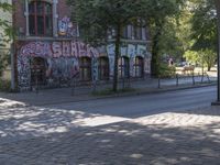 A classic architecture building in Berlin, Germany. The city's urban design is highlighted by the bridge and underpass. The road surface is smooth as asphalt, lined with trees and vegetation. A beautiful European dawn.